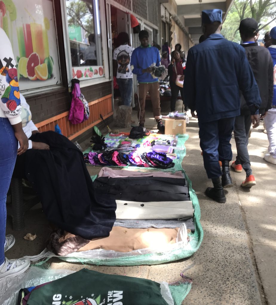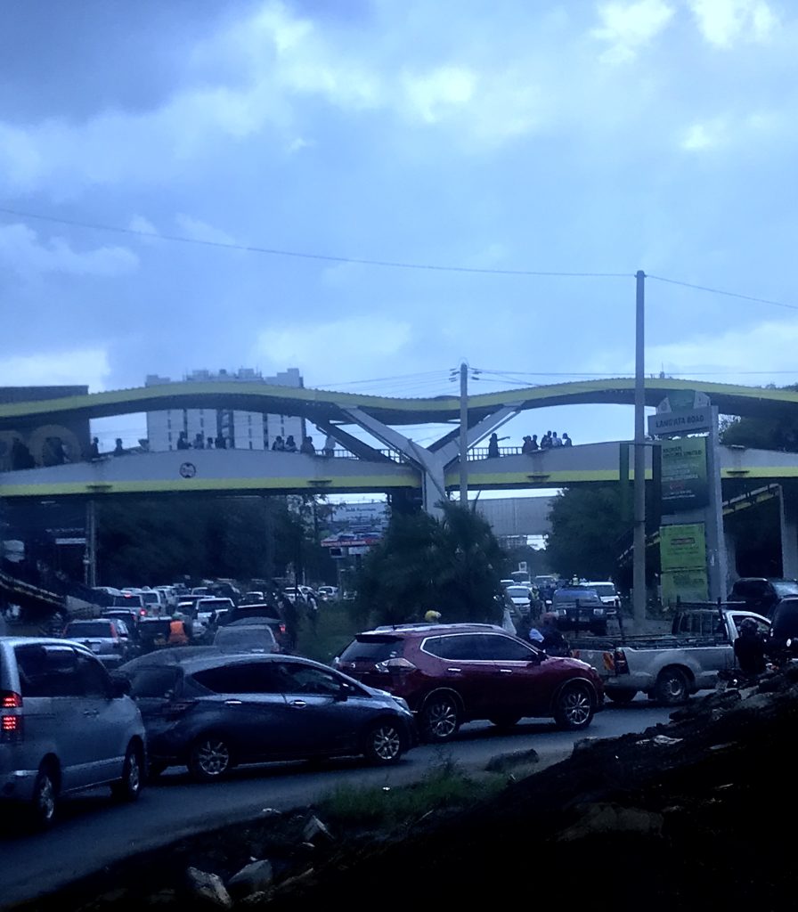 Sidewalk vendors crowd the busy road edges of Moi Avenue on February 29th at 1pm with their stalls spilling onto the pavement and forcing pedestrians onto the road. This causes a danger to the pedestrians since they overcrowd and some are forced to walk on the busy roads where cars are speeding.