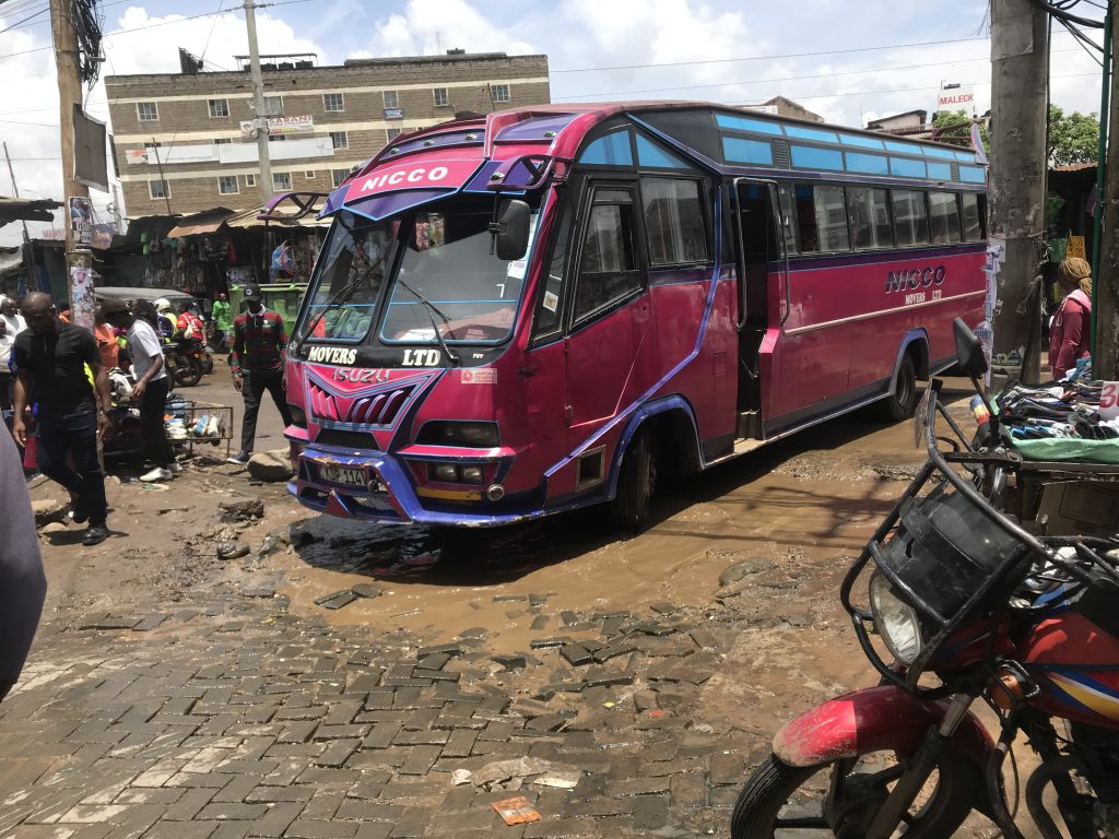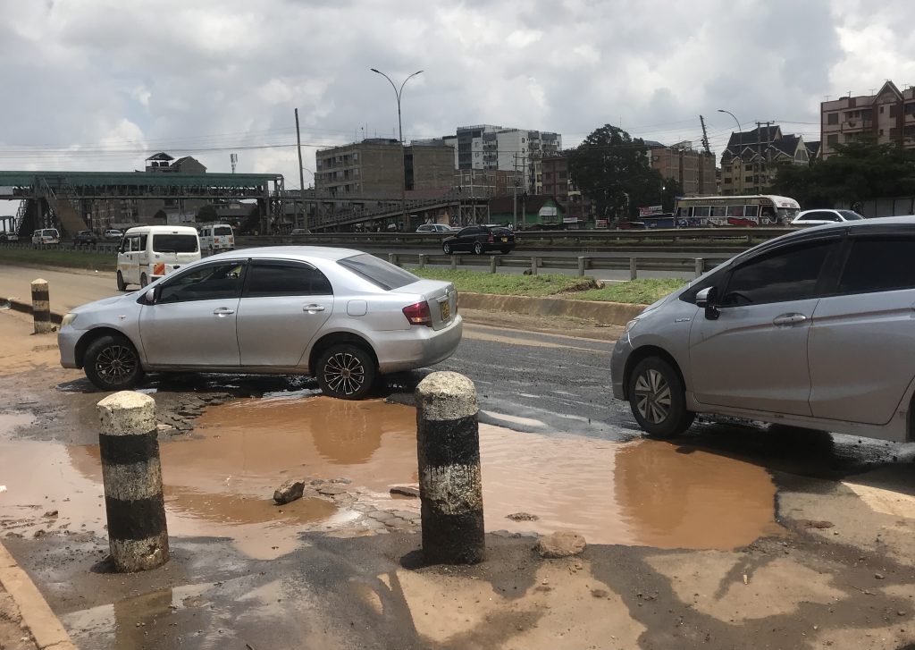 A matatu struggles to navigate a junction on Kirima road Kahawa on February 29th due to a large pothole which has ruined the tarmac.