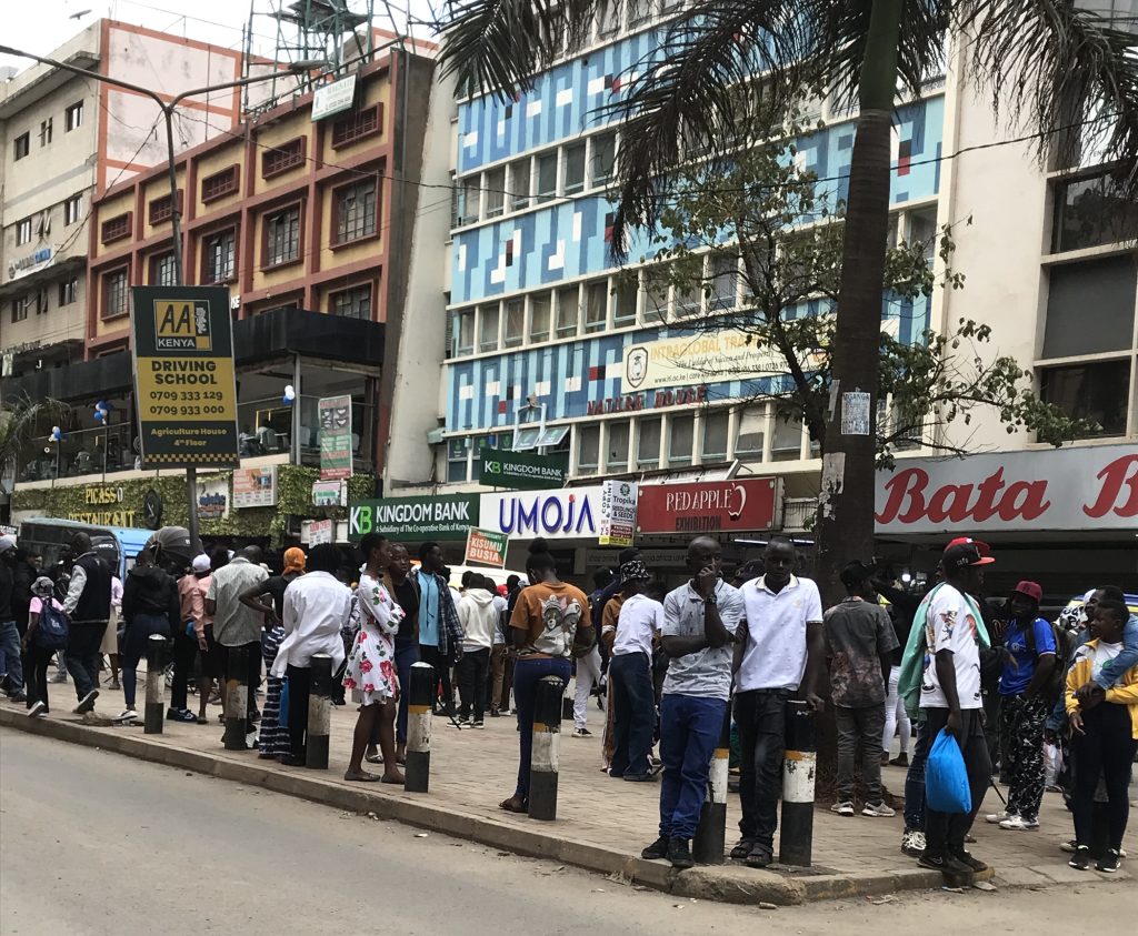 Commuters crowd the roadside of Afya Center Street on February 29th waiting for matatus as traffic slows during rush hours .The heavy congestion reflects Nairobi’s growing demand for public transport and the strain on city streets and infrastructure. Photo Credits Karen Ndanu.